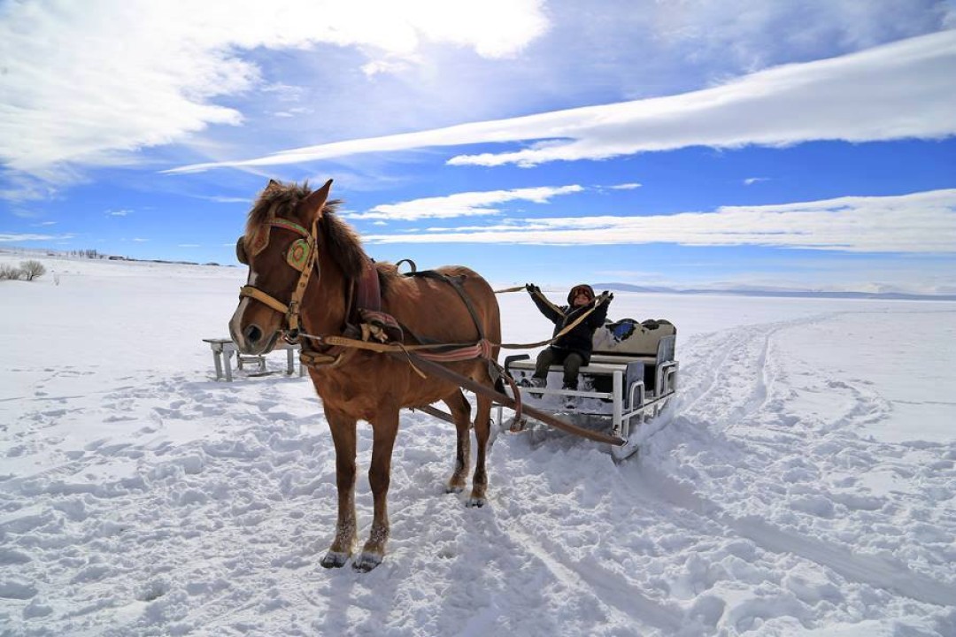 Buz kalınlığının güvenli seviye olan 70 santimetreye ulaşmasıyla birlikte, çivili nalları sayesinde buzda kaymadan ilerleyen atlar, arkalarındaki kızaklarla turistleri gölün derinliklerine doğru eşsiz bir yolculuğa çıkarıyor. Adrenalin tutkunları için zaman zaman dörtnala koşturulan atlar, izleyenlere görsel bir şölen sunuyor.