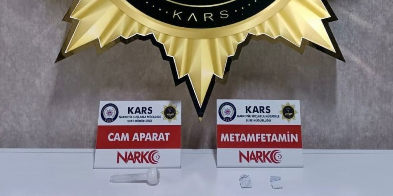 Kars Emniyet Müdürlüğü Narkotik Suçlarla Mücadele Şube Müdürlüğü ekiplerince gerçekleştirilen operasyonda yapılan aramalarda, 2 parça halinde toplam 2,11 gram metamfetamin, içerisinde uyuşturucu madde kalıntısı bulunan cam aparat ile uyuşturucu paketlemede kullanılan kağıt ele geçirildi.