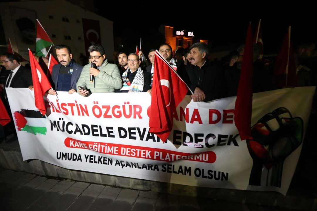 Grup adına konuşan Kars Eğitime Destek Platformu Başkanı Ayhan Yüreğir, katil terör devleti İsrail, her fırsatta insanlık değerlerini ve uluslararası hukuku hiçe sayan bir saldırganlıkla, mazlum Filistin halkına ulaşmaya çalışan yardım girişimlerini hedef aldığını söyledi. Yüreğir; Bizler, bu vahşeti lanetliyor, Sümud Filo’sundaki yardım gönüllülerinin derhâl serbest bırakılmasını, yardım malzemelerinin Gazze halkına ulaştırılmasını ve İsrail’in bu korsan eylemleri karşısında uluslararası toplumun sessiz kalmamasını talep ediyoruz. Unutulmamalıdır ki, zulümle abad olunmaz. Gazze’ye giden her yol, özgürlüğün, adaletin ve insanlığın yoludur. Katil İsrail, er ya da geç işlediği suçların hesabını insanlık önünde vermek zorunda kalacaktır.