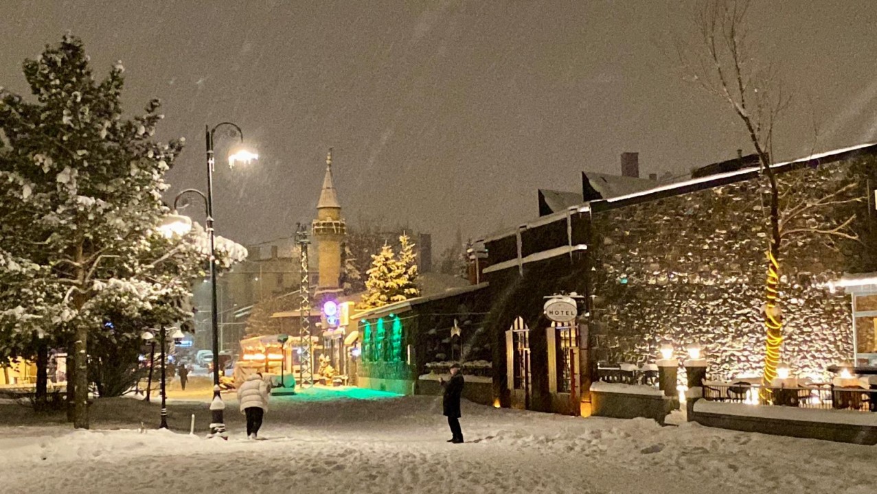 Kars, yoğun kar yağışı altında adeta bir kartpostala dönüştü. Şehrin tarihi dokusu, karın beyaz örtüsü ve sarı ışıkların aydınlatmasıyla büyüleyici bir manzara oluşturdu.