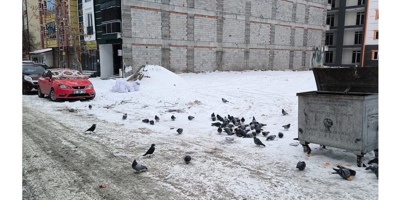 Kars'ta meydana gelen kar yağışı, şehri beyaz bir örtüyle kaplarken, güvercinlerin doğal yaşam alanlarını kısıtladı. Kar nedeniyle yiyecek bulmakta zorlanan güvercinler, şehir merkezinde çöp kutularının etrafında yiyecek arayışına girdi.