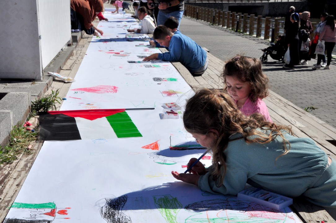 Kars'ta İsrail'in Gazze'ye yönelik süren saldırılarını protesto etmek ve savaşın mağdur ettiği Filistinli çocuklara destek vermek amacıyla "Filistinli çocuklar için çiz" etkinliği düzenlendi. Kars İnsani Yardım Vakfı (İHH) öncülüğünde gerçekleştirilen organizasyonda, 250 metre uzunluğunda tuval serilerek çocuklar ve aileler resimlerle duygularını ifade etti, bazı çocuklar ise Filistin bayrağını öptü.