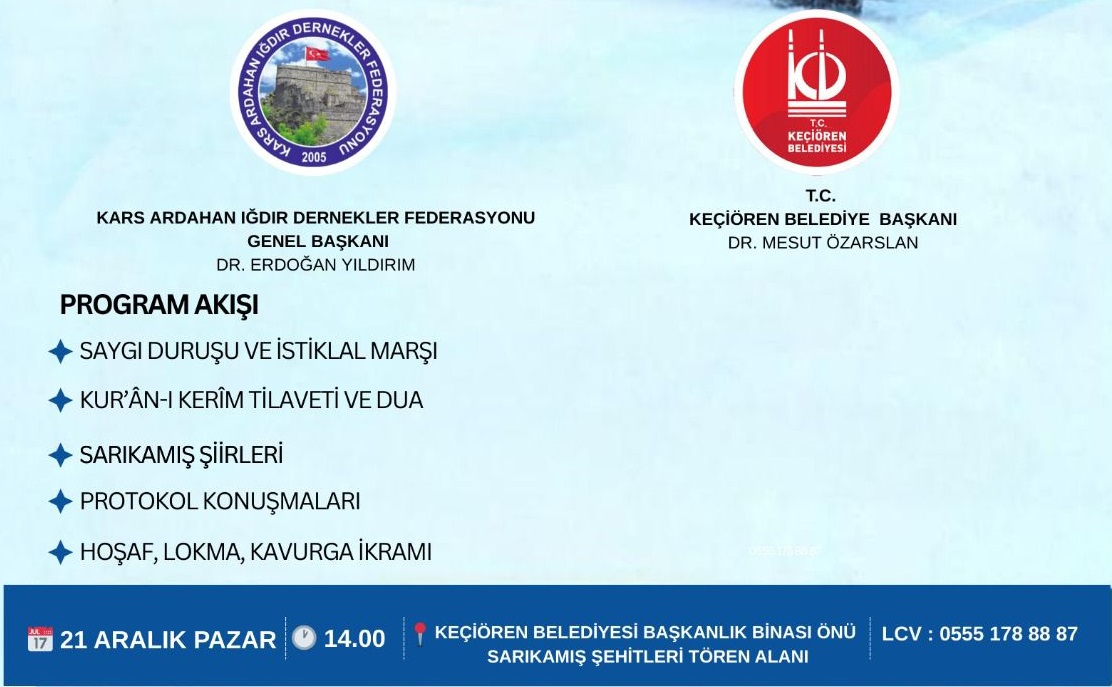 Ankara Keçiören Belediyesi ve Kars Ardahan Iğdır Dernekler Federasyonu (KAI-FED) tarafından Sarıkamış Destanı’nın her yıl olduğu gibi bu yıl dönümünde de anma Programı düzenledi. Sarıkamış Allahu Ekber Dağları’nda donarak hakka yürüyen 90 bin şehidi yâd etmek için anma programı Keçiören Belediyesi binası önünde gerçekleşecek.