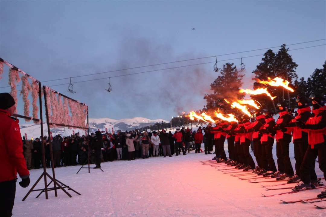 Sarıkamış Kayak Merkezi'nde düzenlenen etkinlikte, ellerindeki meşalelerle zirveden inen JAK timleri, kayak pistinde demirden yapılan "Sarıkamış 111. Yıl" yazısını ateşledi.